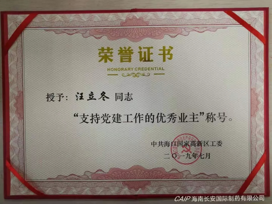 為表彰先進(jìn),弘揚(yáng)正氣,中共海口國(guó)家高新區(qū)工委分別授予海南長(zhǎng)安國(guó)際制藥有限公司黨支部書記汪立冬和黨支部委員陳麗娟“支持黨建工作的優(yōu)秀業(yè)主”和“優(yōu)秀黨務(wù)工作者”稱號(hào)。