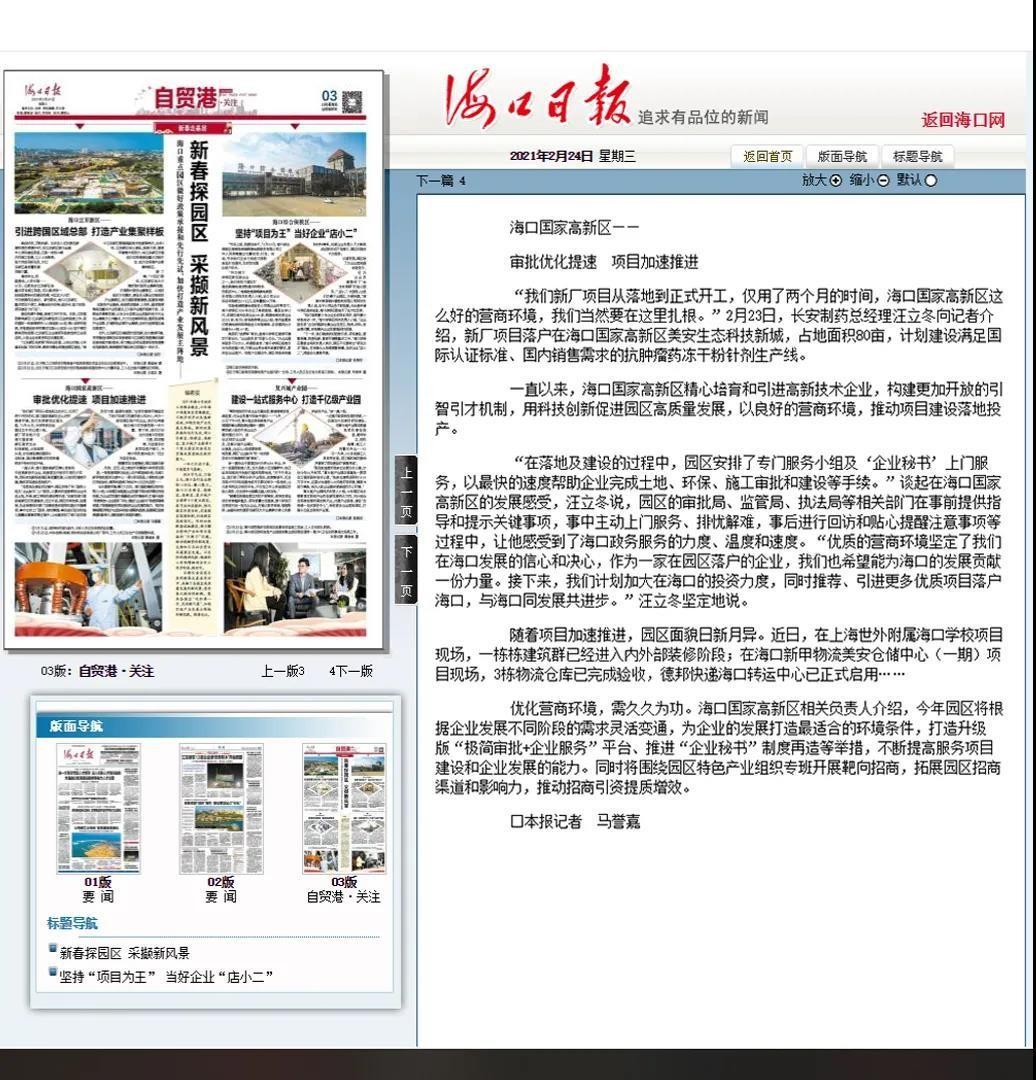 2月24日,《海口日報》發(fā)表文章——“審批優(yōu)化提速 項目加速推進(jìn)”,《??谌請蟆穼﹂L安制藥總經(jīng)理汪立冬進(jìn)行了專訪,文章提到:在長安制藥美安科技新城新廠建設(shè)項目落地到開工的審批進(jìn)程、項目的推進(jìn)速度等方面,都感受到了??趪腋咝聟^(qū)內(nèi)提供的良好營商環(huán)境和海口政務(wù)服務(wù)的審批提速。全文報道如下: